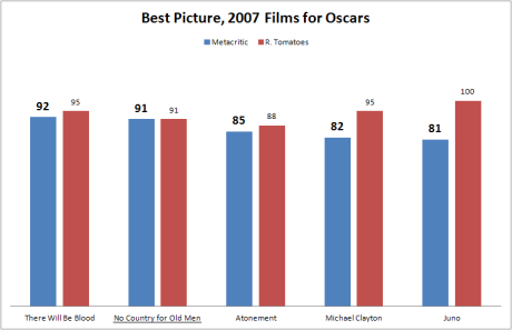 I think this year best summarizes the differences between the two methods: I liked Juno, I bet most filmgoers liked Juno, but that doesn’t mean that most people thought it was exceptionally good. I liked There Will Be Blood too but I think it represented a deeper meaning, a heavier and more complicated reality than Juno did, and simply asking critics if they liked a movie will never show this distinction. I wouldn’t draw too much from No Country for Old Men losing out as the difference was likely down to how much coffee Ebert drank when he wrote the review.