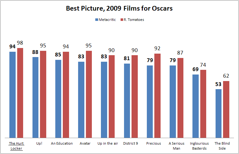 The suspense of the Oscars race between The Hurt Locker and Avatar does not bare out when using metacritic, as the gap is wide. Avatar’s high chances at the Oscars could have been related to its reputation as a rev0lutionary step in film production and special effects in particular. Needless to say, critics were less impressed by this.