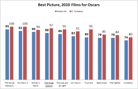 I’ve created bar graphs that compare films selected for the past four Oscars in the “best picture” category and I’ve ranked them by their metacritic score (underlining the film that actually won). I also listed Rotten Tomatoes’ percentages using the “top critics” option from the site: