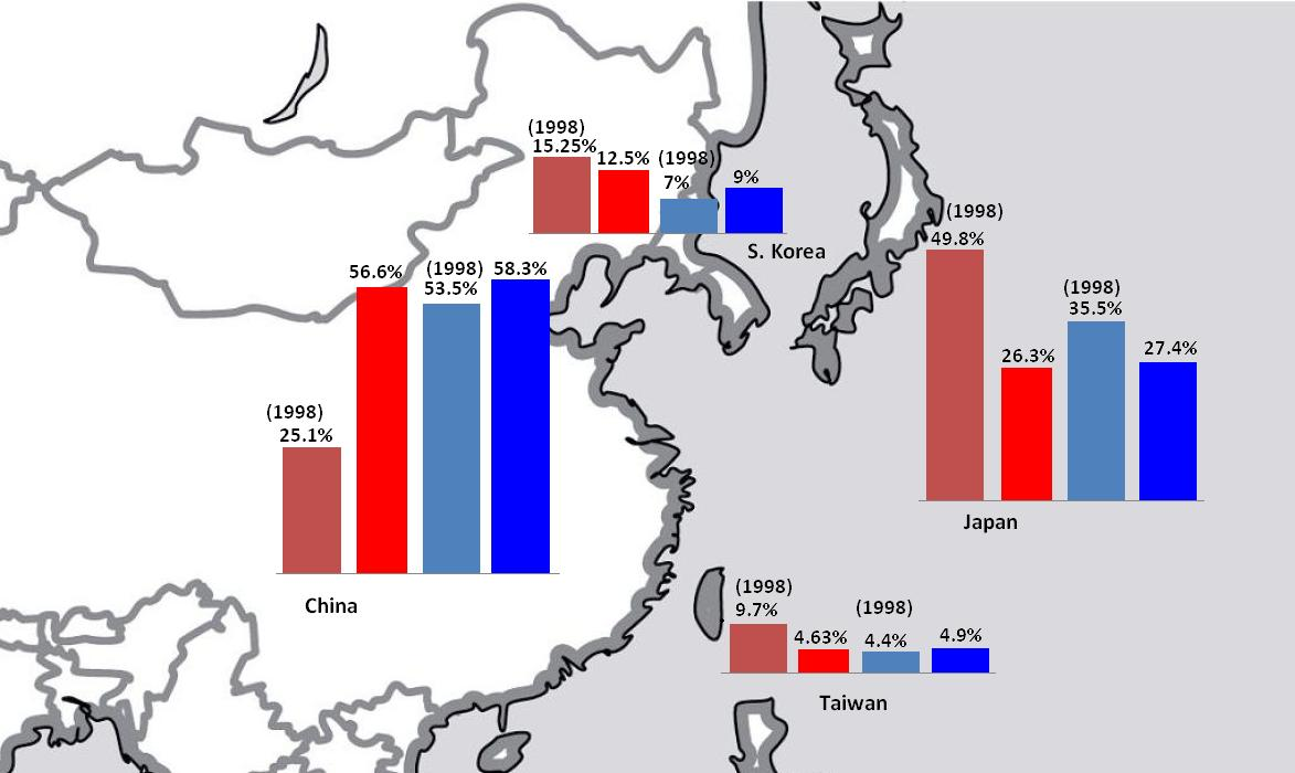 As alluded to earlier, the recent hostility between Japan and China has received most of the coverage in this region recently. In many ways the anxiety over the confrontation between Japan and China comes from the the transformation in roles the two countries have had economically: