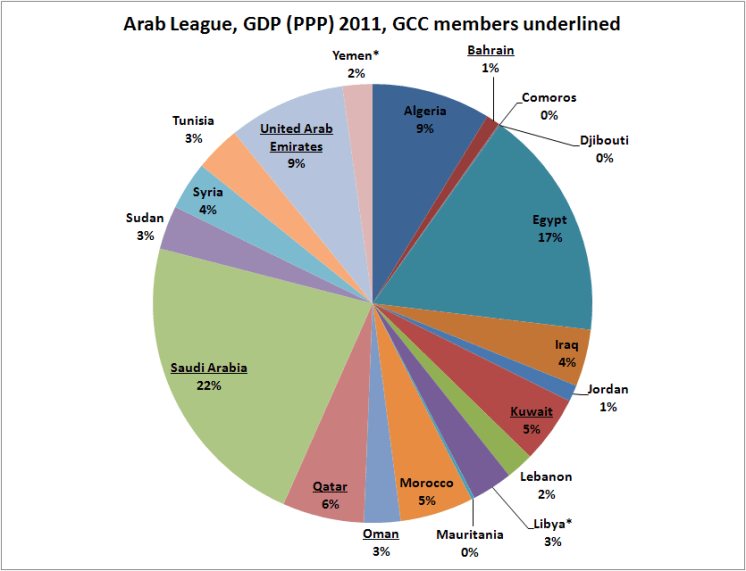 I think this graph is especially important as recent uprisings in the Middle East have captured the attention of the world. Like so many things in the region, the uprisings must be viewed in a context includes more than just relative GDP, but this graph offers some perspective on recent events. Just as Tunisia had seen its president abdicate power and Cairo’s Tahrir Square was swelling with protestors, the Gulf Cooperation Council (led by Saudi Arabia) invited the Morocco and Jordan to join the oil producing group. The move was widely interpreted as an effort to stymie the revolution retain Saudi Arabia’s influence in the Arab League. Even without adding Jordan and Morocco the combined wealth of the Gulf Cooperation Council makes up 46% of the Arab League, it would have a majority of the League’s wealth were it to include the two monarchies.