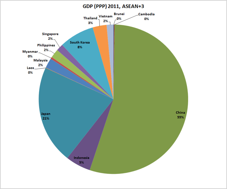 ASEAN attracting small regional nations may not seem like a big deal, but certainly role in the response to the 1997 Asian financial crisis was. The financial crisis devastated much of Asia and the IMF’s response was highly criticized by many inside Asia and beyond. In 2000, finance minsters from ASEAN member-states plus China, Japan, and South Korea met at and produced what is now called the Chiang Mai Initiative. What started out as a currency-swap agreement has evolved (at least conceptually) into a regional bailout fund, with a role akin to the IMF itself. The initiative is managed at a summit connected to the annual ASEAN meetup, with the expanded group called ASEAN+3. Now, with a bailout fund of $240 billion, ASEAN+3 is a critical piece of Asian integration. What does a graph of this expanded group look like?