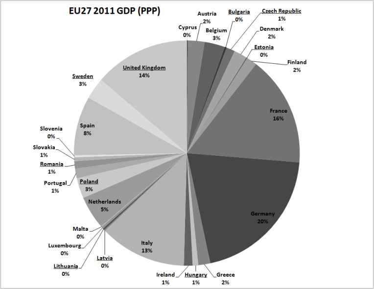 In this blog I want to look at relative power and measure it within various international organizations. But before I go any further I want to make one point clear: I am not attempting to predict actual influence in international organizations, I am merely measuring theoretical influence in these organizations and leaving it up to the viewer to draw whatever conclusions from this. Having said that, I’ve found several articles about recent events that relate to the power-dynamics in these organizations. For most of these graphs I will be using Gross Domestic Product based on Purchasing Power Parity as a basis for potential influence in groups. I collected the statistics from the IMF (here) and all but a few exceptions are from 2011.