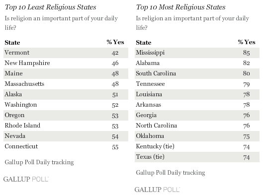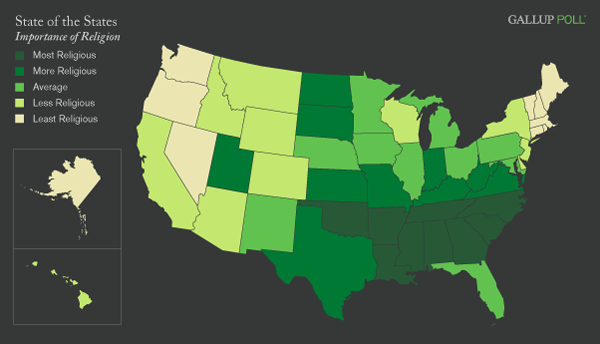 One finds the least religious states in the West and the Northeastern parts of the US. here’s a look at the percentages: