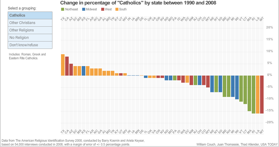 “Religious switching along with Hispanic immigration has significantly changed the religious profile of some states and regions. Between 1990 and 2008, the Catholic population proportion of the New England states fell from 50% to 36% and in New York it fell from 44% to 37%, while it rose in California from 29% to 37% and in Texas from 23% to 32%.” (source)