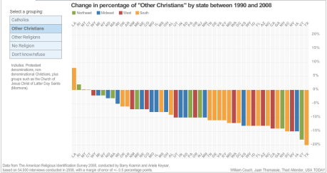 Only Rhode Island and Louisiana saw growth here. Louisiana is interesting because it saw a 16% decline in Catholic-identified people during the same time, perhaps they converted to Protestantism or more likely, Hurricane Katrina reshaped the demographics of the state.